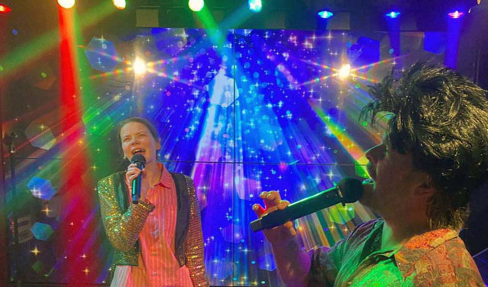 The Centre Stage Disco karaoke 'machine' consists of two screens, space permitting. A small screen for the singer and a large screen which faces the audience. Furthermore, with Centre Stage Karaoke, you get the FULL disco show too! You can choose the percentage of karaoke-to-disco you like. What's that you ask? You want 100% karaoke? That's no problem!